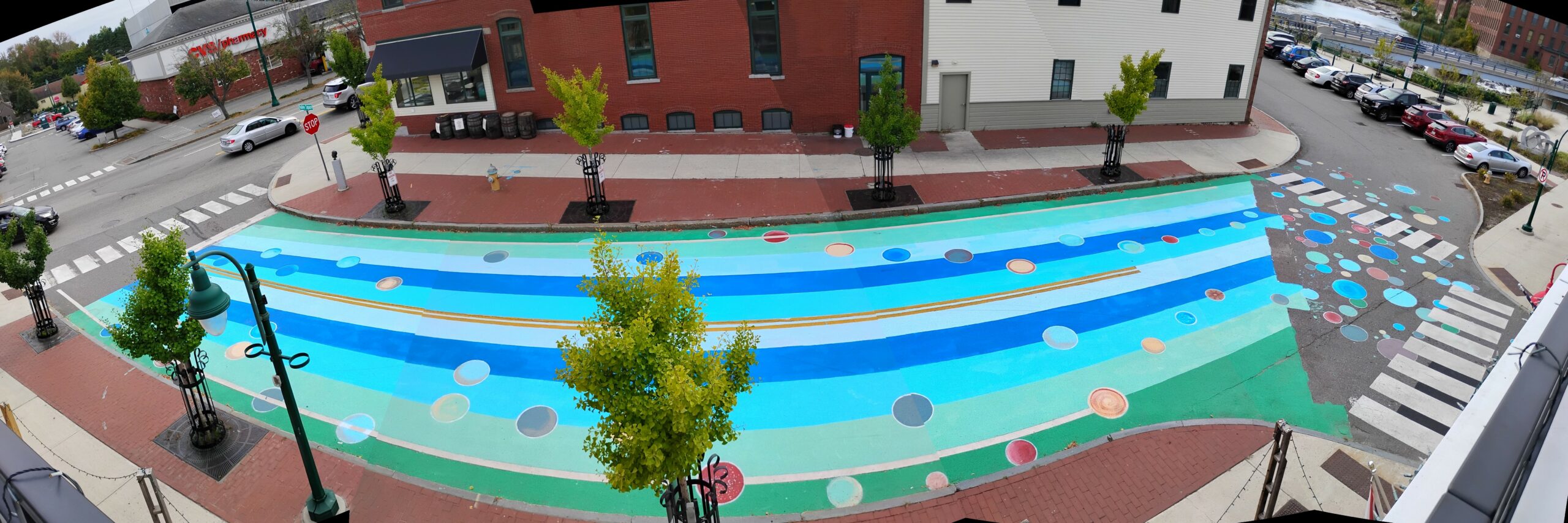 This summer, we kicked off the Vallee Square Concert Series in downtown Westbrook with a community street painting project that not only brightened the space with color but also honored the city’s history and its connection to the Presumpscot River. Led by local artist and board member Michael Shaughnessy, a USM Art Professor, volunteers came together to transform the street and barriers of Vallee Square into a vibrant mural. The paint for this project was generously donated by Westbrook Sherwin-Williams.